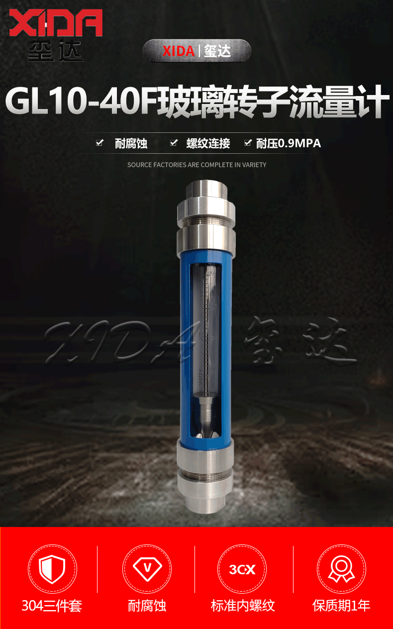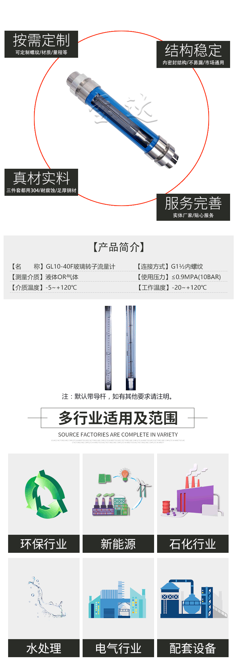 GL10-40F防腐玻璃轉(zhuǎn)子流量計(jì)是一款通過浮子變化測(cè)量量程,可測(cè)量有腐蝕的氣體or液體的流量計(jì)。
