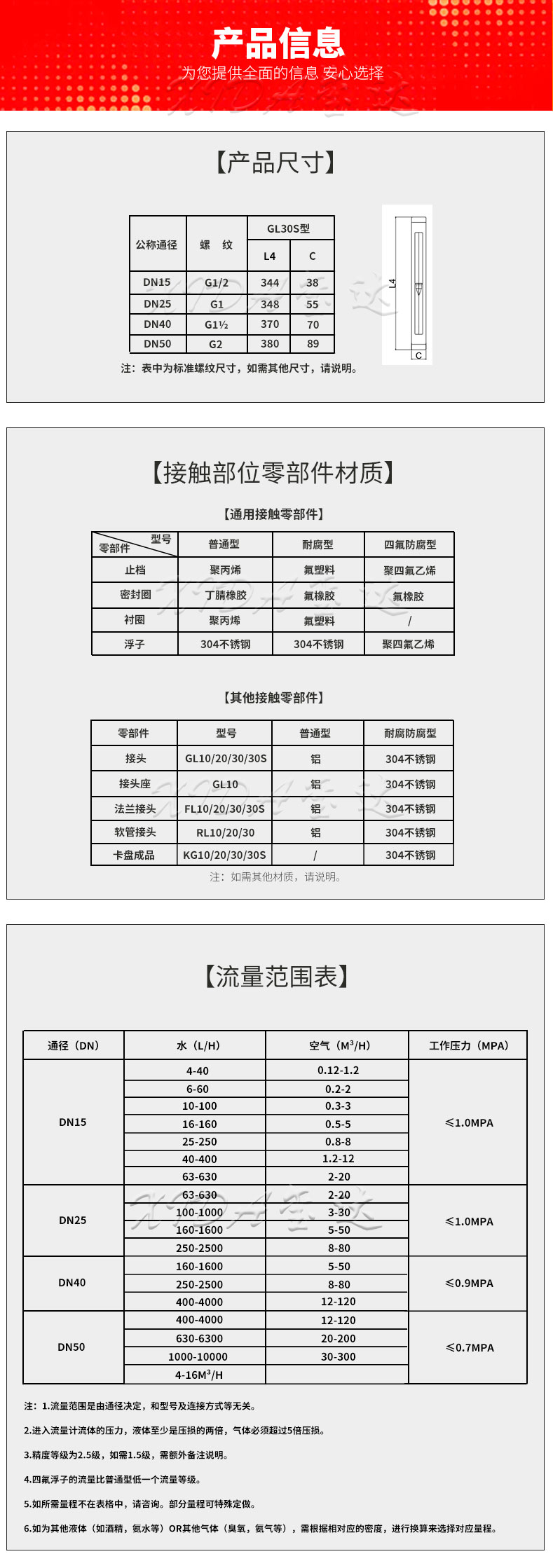 延伸:GL30S-15玻璃轉(zhuǎn)子流量計(jì)是屬于30S系列中的螺紋型玻璃轉(zhuǎn)子流量計(jì)。連接方式除了螺紋連接,還有法蘭連接流量計(jì),衛(wèi)生級卡盤流量計(jì)。如需口徑或量程不同,可選擇DN25,DN40,DN50大小。
